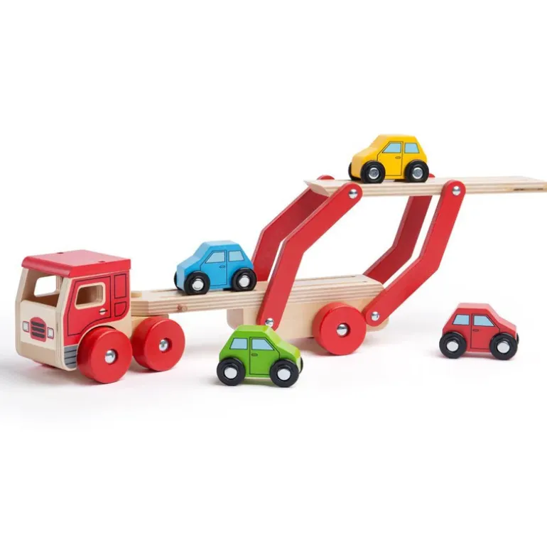 This wooden car transporter push along toy helps to develop dexterity and co-ordination and carries a load of four brightly coloured wooden cars. The upper deck can be easily lowered to allow each vehicle to drive on and off and grooves in the surface help to keep each car in place as they’re transported to their destination.