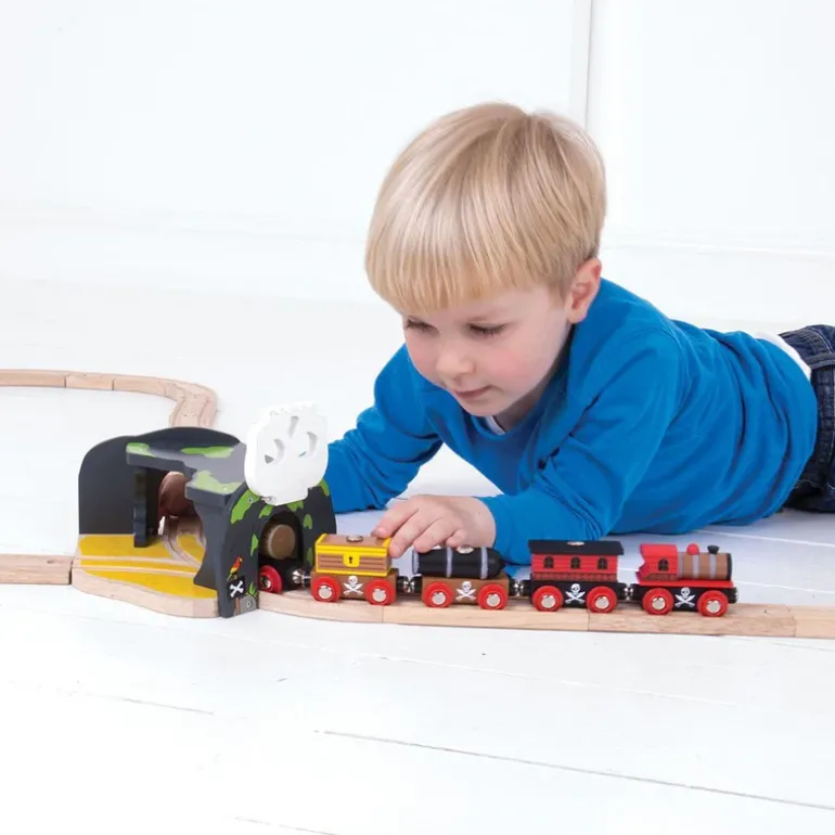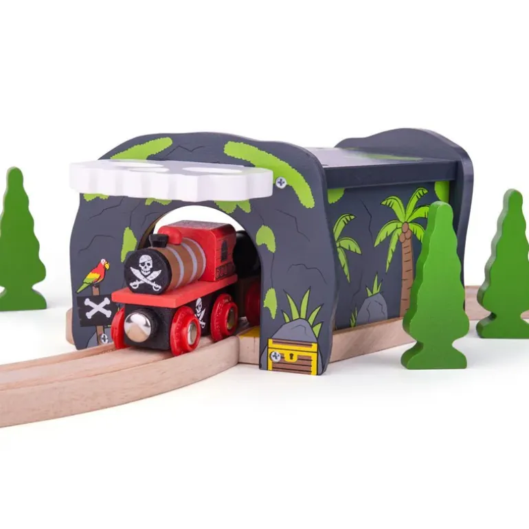 This wooden Skull Cave includes two pieces of track in the base to increase placement options within a wooden train set track layout and create two tunnel entrances or exits.Lift the elasticated skulls on either end of the toy train tunnel and guide your train through the skulls or journey through the fallen rock.Encourages imagination, dexterity and coordination. Most other major wooden railway brands are compatible with Bigjigs Rail.