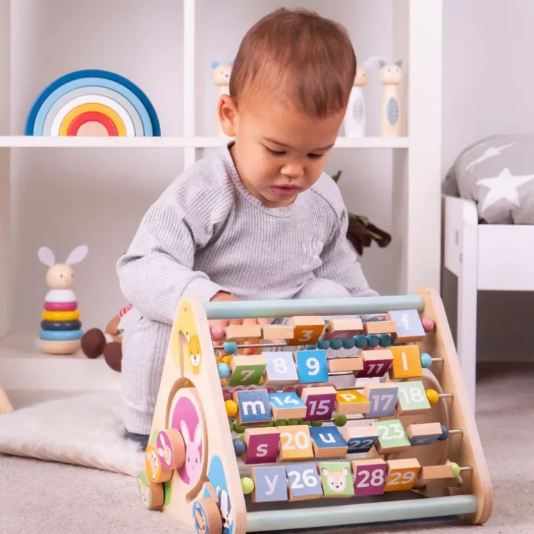 Explore the animal blocks, spin the alphabet squares, and sort the animal faces with our FSC® Certified Wooden Activity Centre. With five sides packed full of fun, tots can learn how to count with the abacus beads, how to match the different animals and much more!