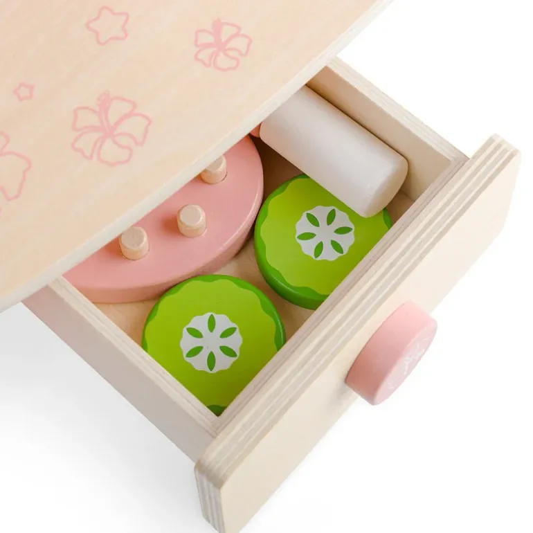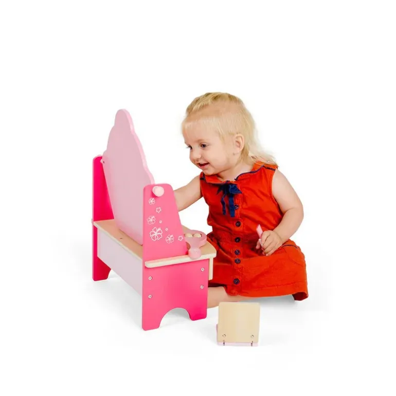 Designed with hours of imaginative play in mind, our children’s wooden vanity table comes with a vanity unit with two drawers and a mirror plus a wooden makeup compact, cucumber slice, face roller, hairbrush, lipstick, perfume and nail polish.