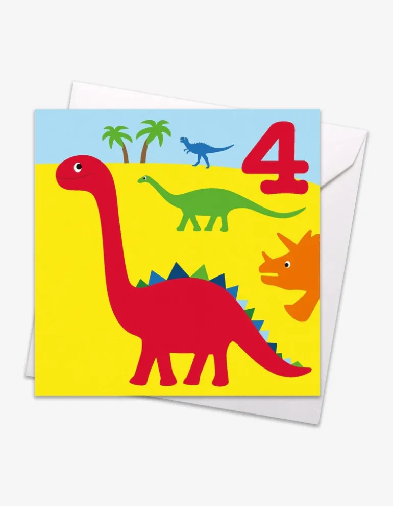 It’s fab to be 4! Celebrate with our friendly dino birthday card. All our occasion cards come with a plain white envelope and are printed in the UK from sustainable forests.