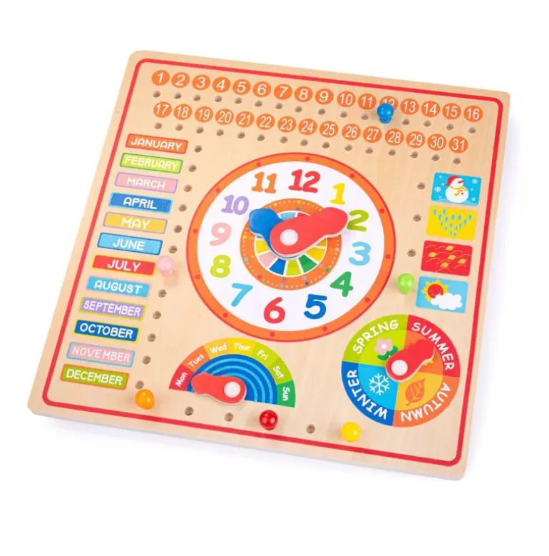 Get ready to have fun and learn with our Wooden Clock and Calendar! This unique toy offers endless opportunities for learning, from telling time on the big clock to learning the months and days of the week. With peg boards and dials for days and seasons, this educational toy is the perfect addition to any play area.