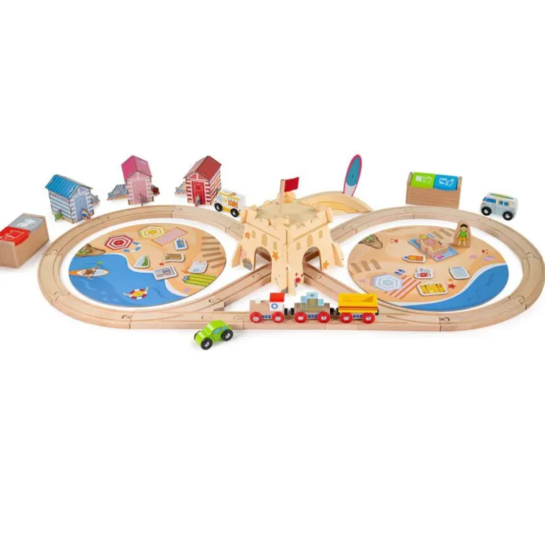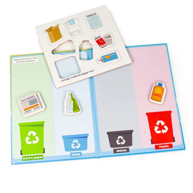 Oh, we do like to be beside the seaside! Enjoy a coastal adventure as the toy train and two carriages chug past a giant sandcastle tunnel, beach huts, sections of beach, beach-goers, cars and recycling bins with this very unique wooden train set. With 70 play pieces, this wooden railway is extensive and provides hours of fun. Kids can learn all about recycling whilst they play – little fingers need to pick up the magnetic pieces and pop them into the correct recycling sorting bins (cardboard, metal, plastic). The perfect eco-friendly toy, the fun doesn’t stop at the Coastal Clean Up Train Set… the magnetic items can also be mix and matched in the included recycling book, packed full of fun recycling facts.