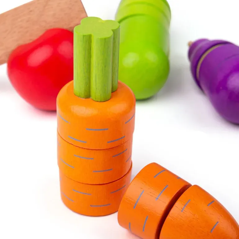 This selection of brightly coloured wooden play food can be sliced up carefully and accurately with the aid of a wooden knife. A great way to teach little ones about kitchen safety. This toy food set includes a white chef’s hat to aid imaginative play. What healthy dishes is the little chef going to create? Toy food is ideal to help your little one to learn about the importance of a healthy and balanced diet, where our food comes from and how we prepare our meals.