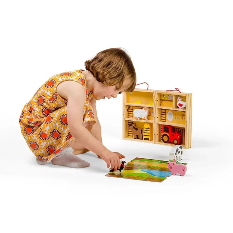 Complete with fold-out play mat scenes to bring the toys to life, the imaginary scenarios are endless. The compact wooden box makes for easy storage and is ideal for taking when on the go or travelling.