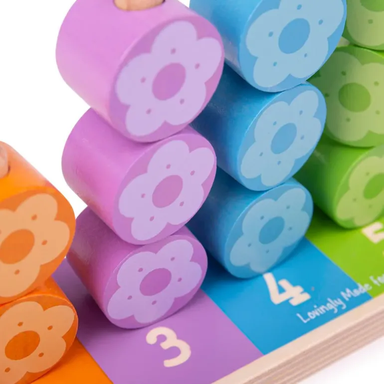 Introduce counting skills with the First Flower Stacker, a quirky wooden toy that matches coloured flowers to their corresponding dots on the baseboard. Stack up and count the flowers, while practicing dexterity and concentration.
