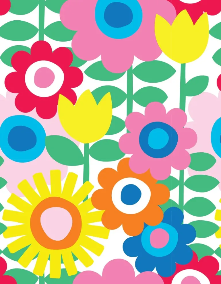 A bold, bright colourful retro-style flower print that’ll cheer up anybody. With a mixture of sunflower and daisy styles with long green stems and leaves to suit. A matching card is also available for the perfect 70’s look.