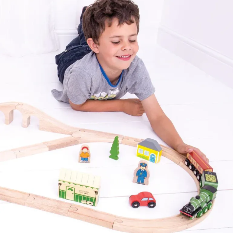 The Bigjigs Rail Heritage Collection offers a delightful range of replicas from the golden age of rail. We are pleased to bring you a wooden train set inspired by the world’s most famous locomotive of all, the Flying Scotsman.Originally built in 1923, the Flying Scotsman is a legend brought back to life by Bigjigs Toys. This licensed train set includes a wooden train track with a viaduct and two junctions.A ticket office, cars, trees, workmen and village folk also help to complete the country landscape. The Flying Scotsman is a classic wooden train set that will never go out of fashion. Consists of 42 play pieces.Most other major wooden railway brands are compatible with Bigjigs Rail.