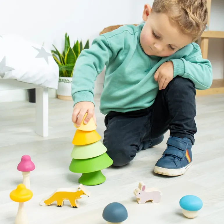 Create enchanted woodland scenes with our Forest Friends set, featuring four mushrooms, a colourful stacking tree, wooden bunny and fox.