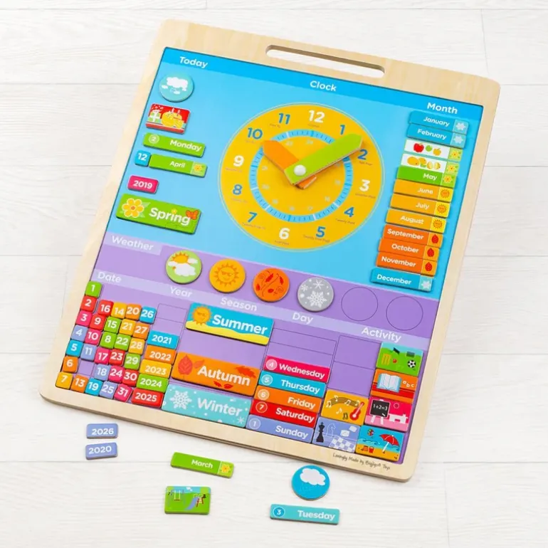 This brightly coloured Magnetic Weather Board will help little ones to learn all about the different seasons and where they fit into the yearly calendar.This weather toy also teaches the different days/dates, months, and years as well as telling time and describing the weather and different activities.The colourful clock face features moveable hands and is the ideal weather toy for toddlers. The 12 and 24-hour clocks each have handy annotations next to each number showing how many minutes past or to the hour each number represents.The magnetic pieces allow for lots of creativity, providing hours of fun along the way. Highly educational and sure to be enjoyed for many years. Helps to develop dexterity and concentration.