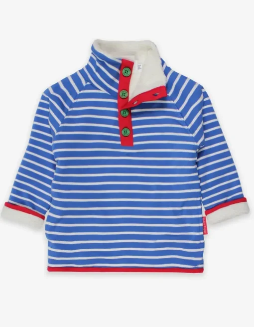 Keep little ones cosy and warm – and super stylish to boot in our blue Breton organic kids fleece. Made from super soft organic cotton , the high collar can be buttoned to up the cosy factor or left loose for a casual look. Plus, there’s some all-important hidden pockets for keeping little hands toasty. The sleeves look equally good turned up or left long – so will last longer with extra growing room! The ultimate winter warmer! And, if you’ve got the Breton bug, full collection of organic childrenswear in Breton stripes online at Toby Tiger.