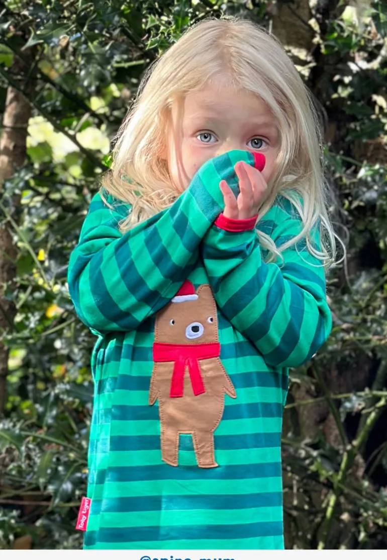 Get into the Christmas spirit with our Organic Christmas Bear Applique Long-Sleeved T-Shirt! This festive shirt features a cute bear wearing a winter hat and scarf, perfect for kids from 6 months to 8 years old. The dark and light green stripes with red trim add an extra touch of Christmas cheer. Made with organic materials, it’s a great choice for the environment and your little one.