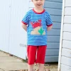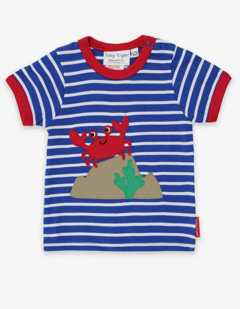 Let’s make sandcastles… watch out for the crab! Don’t worry, our applique pal won’t snap… he’s as soft as this nautical striped 100% certified organic cotton T-shirt. And, for our smaller sizes, we’ve added poppers on the neck for easy changing. Go fishing for more sea life with our ocean-inspired organic clothing online at Toby Tiger.