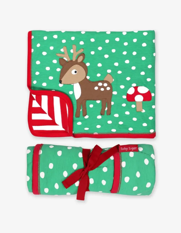 Nap time, chill time, cuddle time – our versatile baby blankets are a must most of the time! Made from our super soft and snuggly 100% certified organic cotton, this festive snowy fabric featuring a soft deer applique has a lovely stripy pattern underside and features a small pocket at the front. This beautiful blanket comes rolled up and wrapped with a contrasting ribbon, and makes the perfect new winter baby gift.