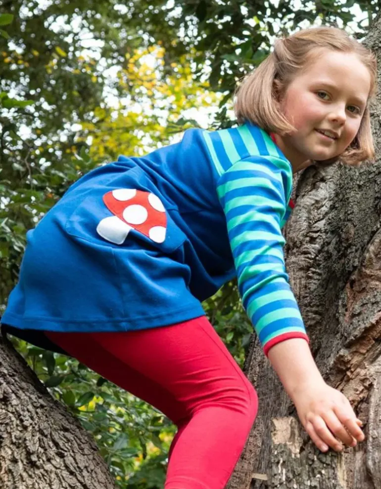 This soft organic cotton dress offers plenty of practical style. With stitched toadstool appliques on the handy little side pockets in deep navy, the contrasting stripy top half with long sleeves and bold red trim. Add a pair of our colourful organic leggings for extra warmth this season – and check out our full matching range here at Toby Tiger.