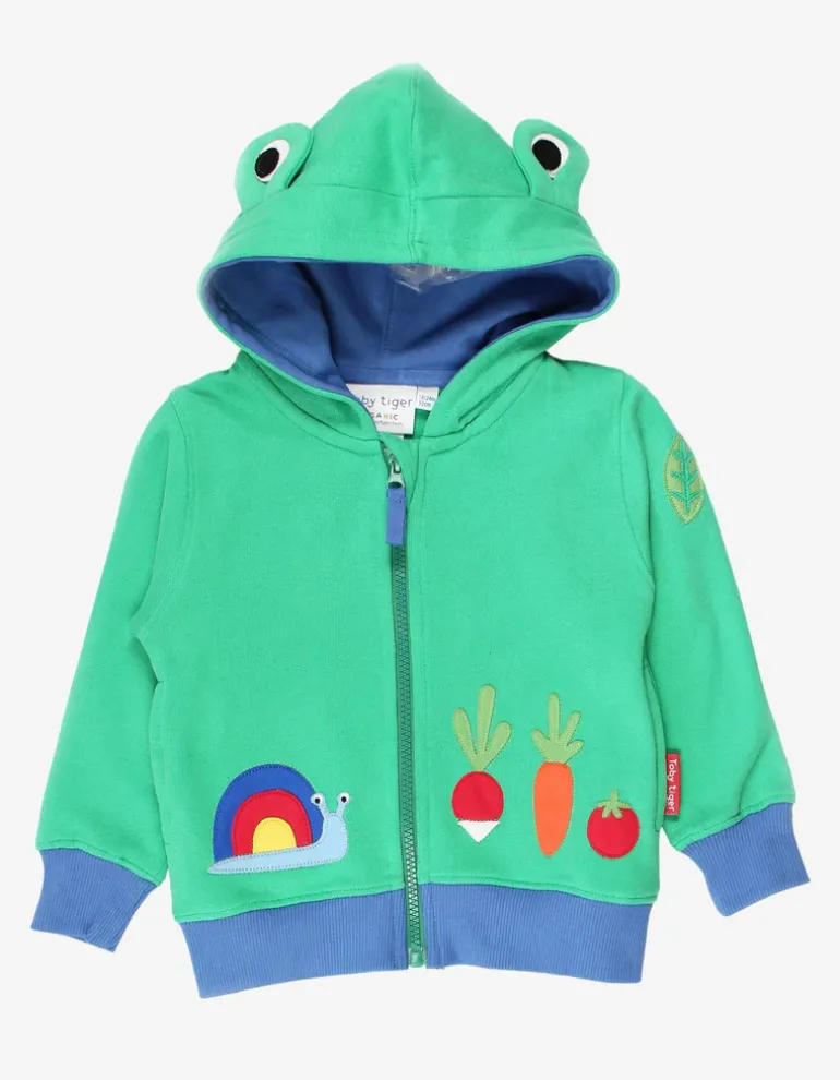 This soft, bold green zip-up hoodie with contrasting blue trim features fun ‘frog eyes’ and spring-inspired stitched appliques for little frogs to spot.
