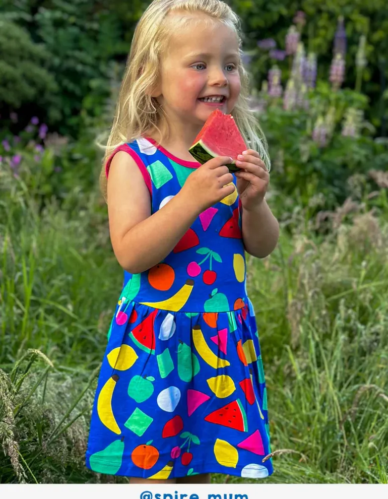 Fruit salad! Our organic cotton kids summer dress showcases bright and zesty fruits – all organic, of course – making it the perfect match! Watermelon, banana, lemon, apples and pears – which one’s your fave? Little ones will love spotting all the types of fruit while the vest top straps and soft organic cotton keeps them cool on the sunniest of days. If you’re a fan of this print, add a little more to the collection – take your pick from our delicious crop celebrating all things fruit, including yoga pants and applique T-shirts.