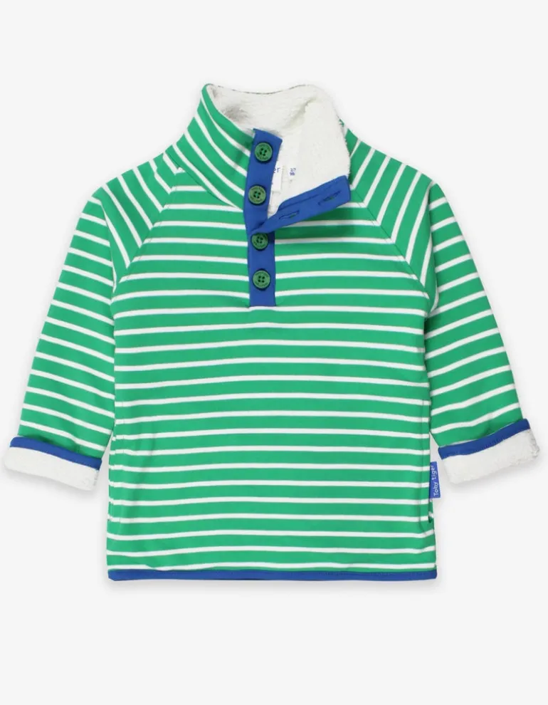 Keep little ones cosy and warm – and super stylish to boot in our green Breton organic kids fleece. Made from super soft organic cotton, the high collar can be buttoned to up the cosy factor or left loose for a casual look. Plus, there’s some all-important hidden pockets for keeping little hands toasty. The cuffs can be turned up so it can last even longer. The ultimate winter warmer! And, if you’ve got the Breton bug, full collection of organic childrenswear in Breton stripes online at Toby Tiger.
