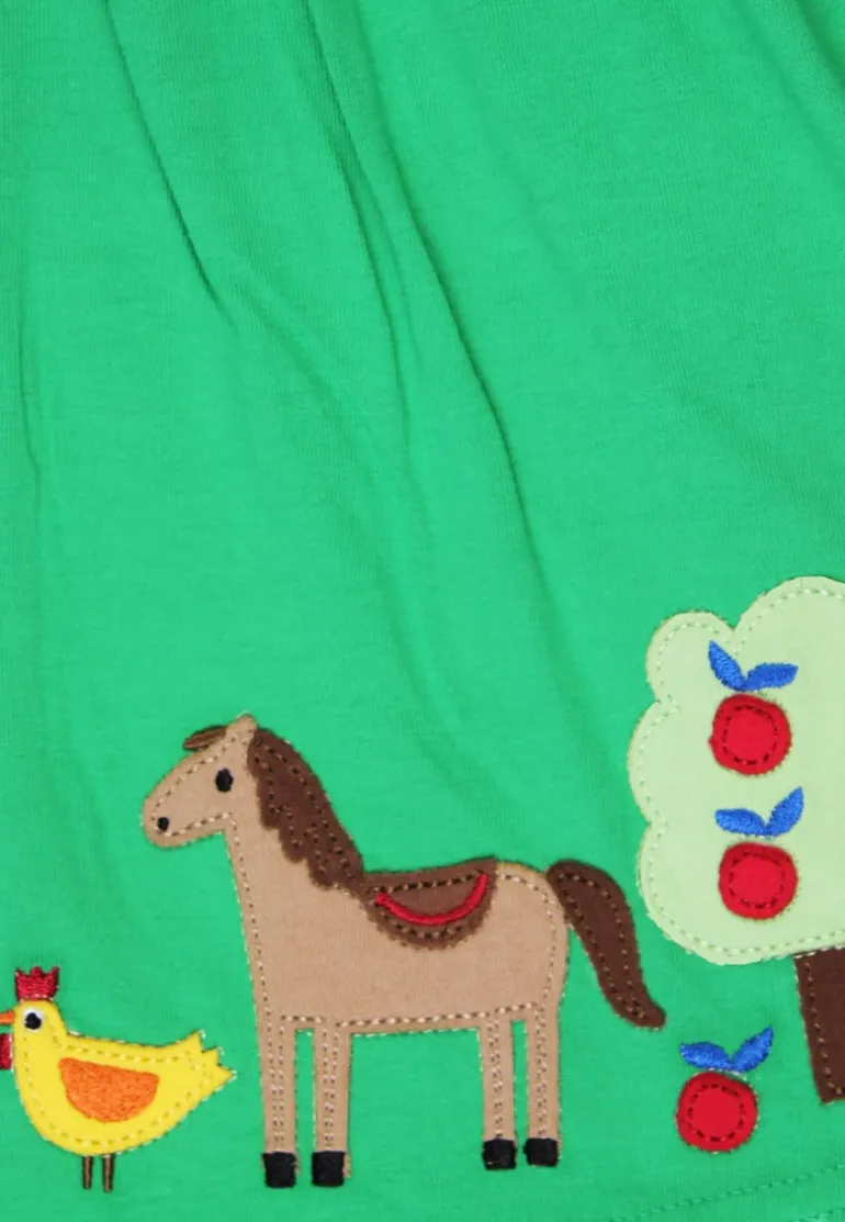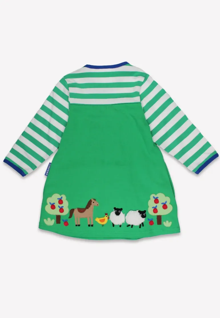 Get ready to frolic through fields with our Organic Hillside Applique Dress! Made from organic materials, this dress is not only environmentally friendly but also features playful applique farmyard animals on the bottom edge.