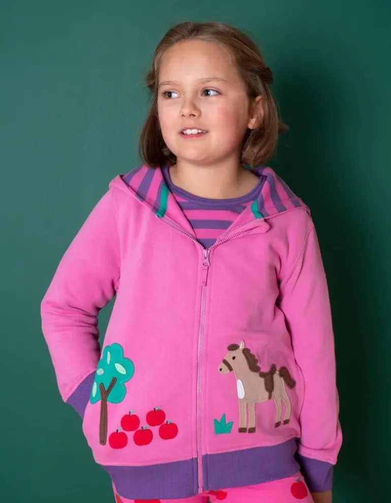 Our playful horse is keeping prepared by storing up her favourite snack – a perfectly red apple – on our soft, stitched applique kids hoodie. Made from 100% certified organic cotton in vibrant pink and purple, this hoodie prepares little ones for those breezier days thanks to the cosy striped lining. Pair with our organic leggings, yoga pants or dungarees from the same Horse and Apple collection, and explore all of our eco-friendly childrenswear designs online at Toby Tiger.