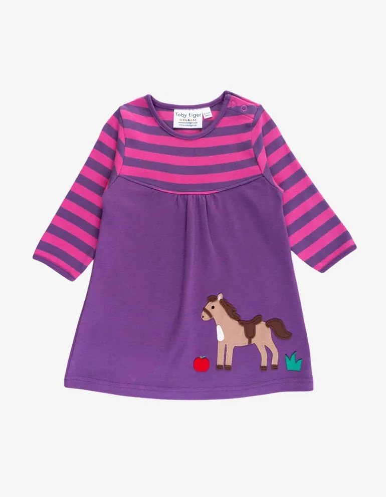 This soft kids organic long-sleeved dress offers plenty of practical style and is a must-have for horse lovers! With our soft stitched horse applique in search of her favourite apple snack featuring on the lower half, the contrasting top half is complemented with contrasting pink and purple stripes and long sleeves. A pair of our colourful organic leggings are great for colder days – check out our full matching range here at Toby Tiger.