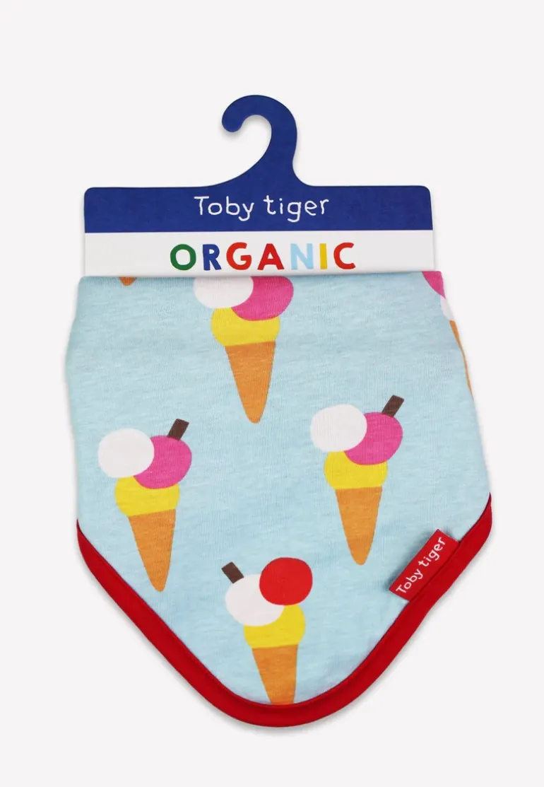 Get your little one ready to dribble in style with our Organic Ice Cream Cones Print Dribble Bib! The light blue jersey bib features a playful ice cream cone print, contrasted with red trim and a pink towelling reverse. Not only does it look cute, it’s also super absorbent and soft thanks to its 100% GOTS-certified organic cotton material.