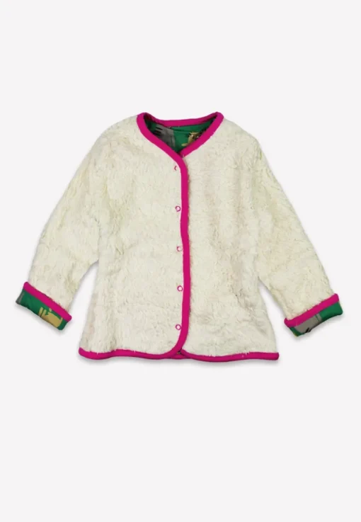 Keep your little one stylish and comfortable with our Organic Kitten Print Reversible Jacket. Made from 100% GOTS-certified organic cotton, this green jacket features a cute grey, pink, and yellow kitten print with pink trim. The cosy fleece-lined inside and side pocket adds convenience and warmth. Environmentally friendly with AZO-free dyes and machine washable.