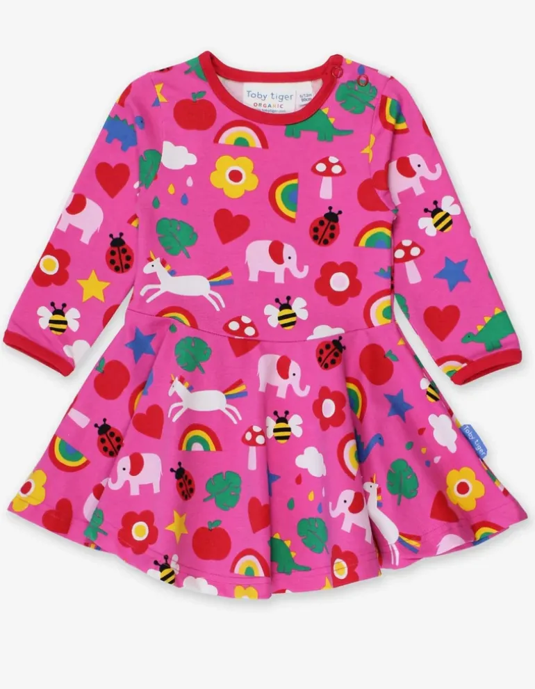 Swirl and twirl in this fab and floaty pink Magical Mix-Up skater dress. Made from super soft 95% organic certified cotton featuring long sleeves, it’ll keep little ones warm all winter. We’ve added neck poppers on our smaller sizes for fuss-free changing. Are you a fan of this print? Check out our entire organic childrenswear Magical Mix-Up collection online at Toby Tiger.
