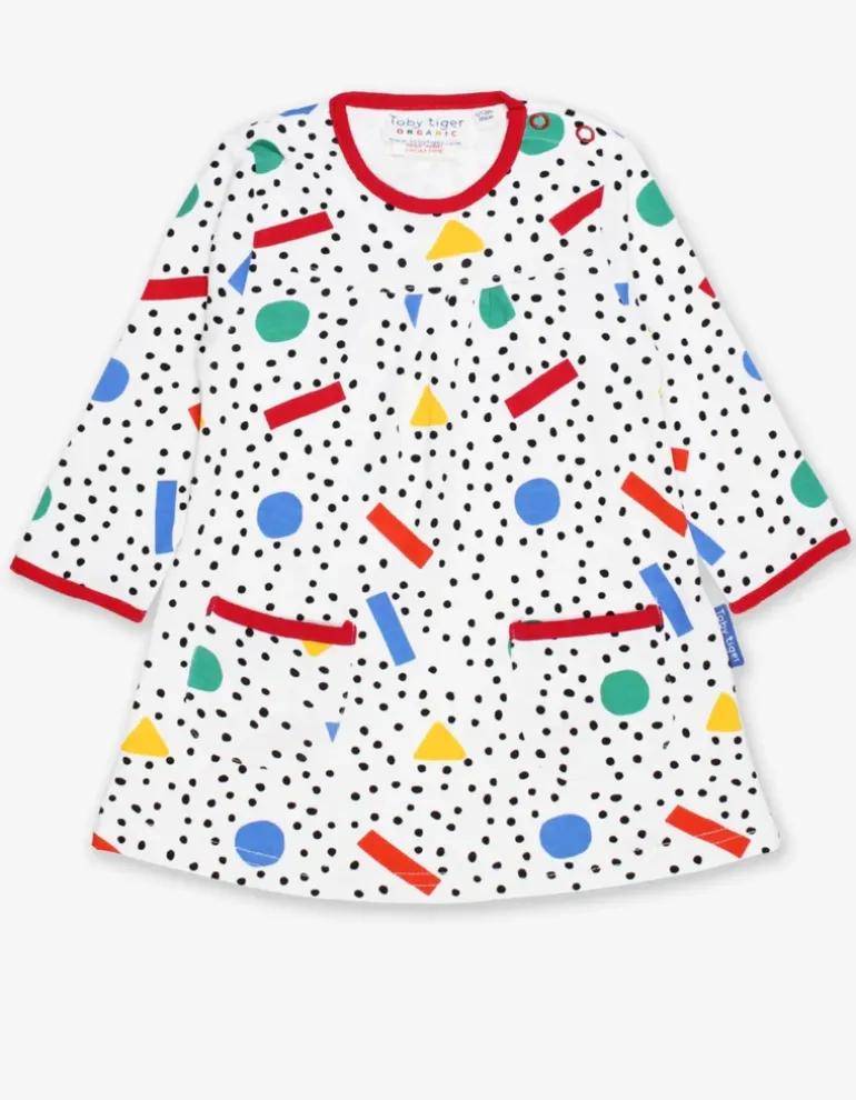 The white dress is a lively canvas with a black-and-white polka dot and multicoloured shapes print. Red trim, with two practical front pockets, make it a fun style to be seen in!