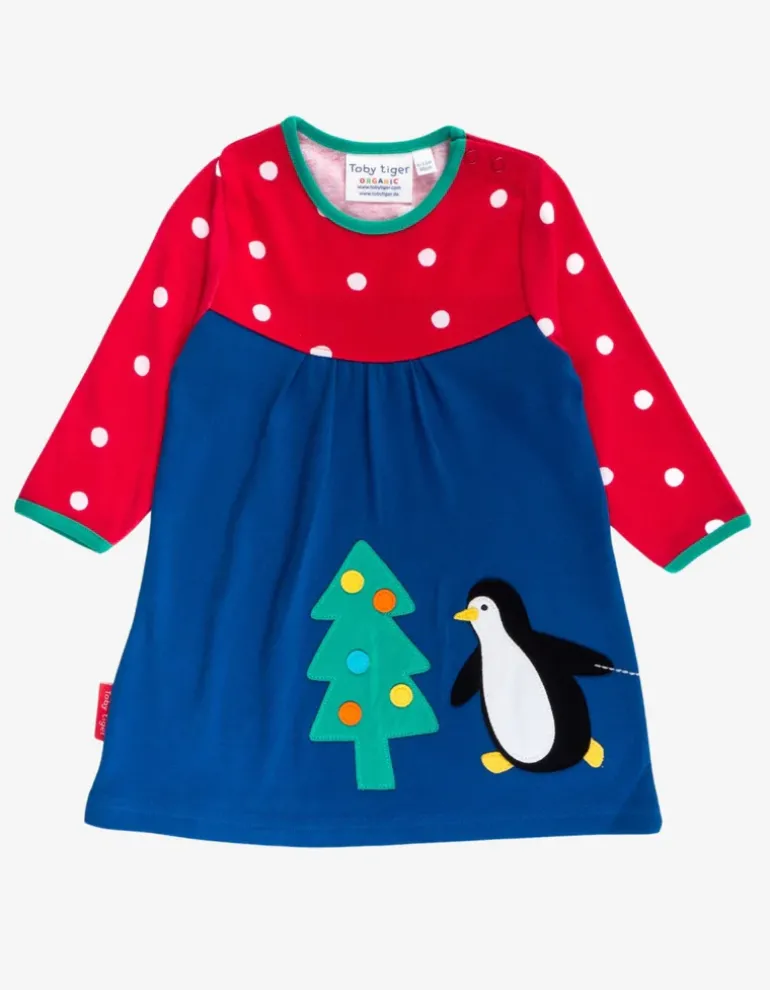 Our applique penguin pal is hard at work putting presents under the tree on this organic Christmas T-shirt. Our gift to you is super soft organic cotton for super cosiness this season, while the festive polka dot top half blending into the classic navy skirt adds superb style. Love the festive look that looks great all winter? Check out our Christmas range online at Toby Tiger.