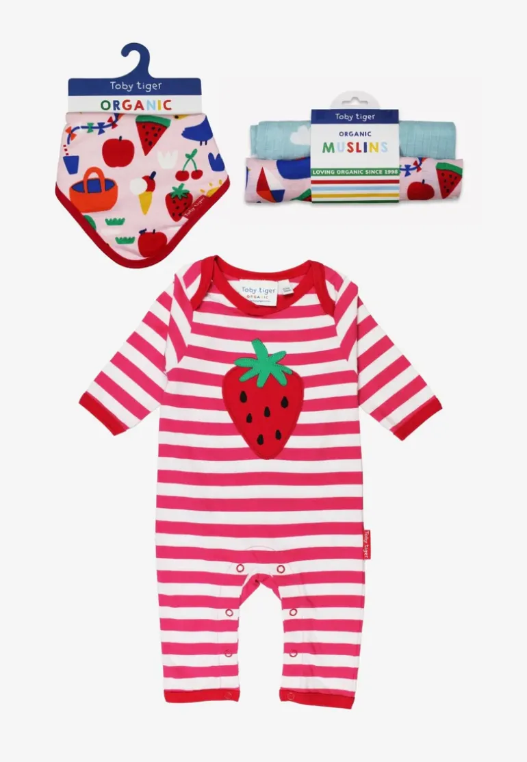Wrap your little one in cosy cuteness with our Organic Picnic Strawberry Applique Baby Bundle. This bundle is made from 100% GOTS-certified organic cotton and includes a strawberry applique sleepsuit, picnic print dribble bib, and 2 pack muslins. With easy-changing features and eco-friendly materials, it’s both practical and cute. Part of our charming Picnic collection.