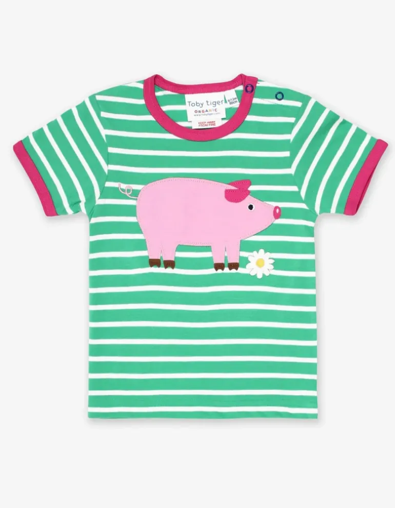 Oink, Oink! This little piggy is taking a stroll in search of daisies. And there are more to be found… can you spot them? This short-sleeved organic cotton T-shirt, with neck poppers on the smaller sizes, is fab teamed with a pair of our organic shorts for easy, breezy summer style. Love this fun farmyard style? Check out our full farming collection of organic childrenswear online at Toby Tiger.