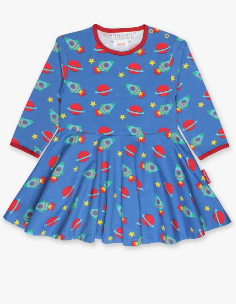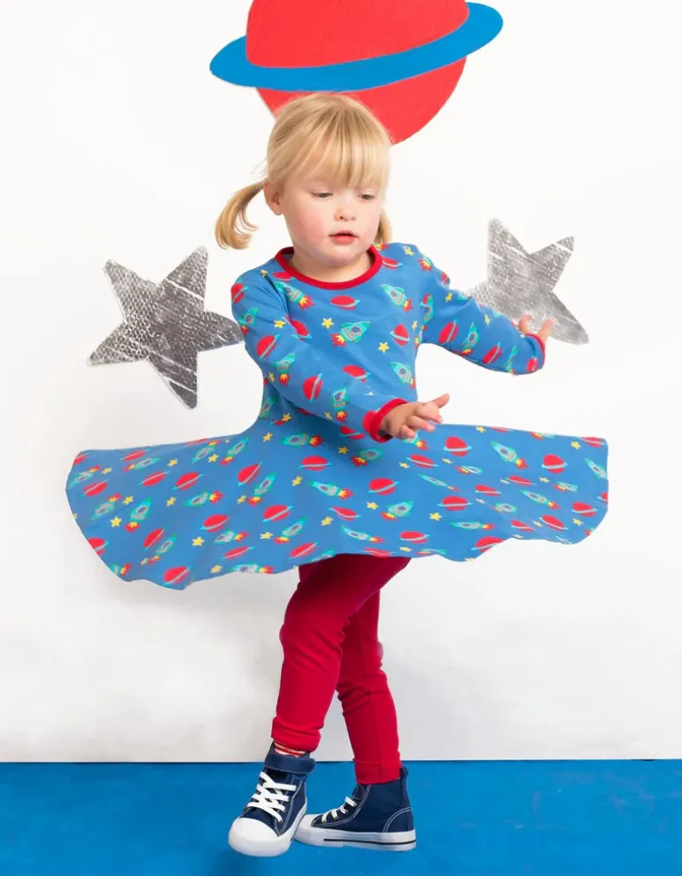 Glide and twirl into the far-off galaxy with this super-spacy skater dress! Our full skirt plus space print will no doubt equal gravity-defying moves! Made from super soft 100% certified organic cotton, we’ve added neck poppers on sizes 6-12 months and 1-2 years for dreamy changing.