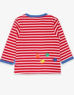 Here we have the lesser known multi-coloured triceratops. With her colourful horns and rainbow frill, she’s happily tucking into her healthy plant-based treat. Talking of treats, this long-sleeved stripy organic cotton T-shirt will keep your little one feeling cosy and snug. Our smaller sizes have neck popper fastenings – you’re welcome!