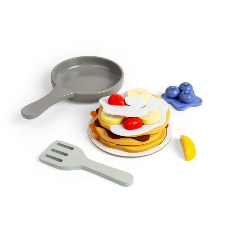 Get ready to cook up an epic make-believe breakfast with our wooden Pancake Set! Choose from a variety of tasty toppings and delicious sauces, like sliced bananas, juicy strawberries, sweet blueberries, and rich chocolate spread, to create the ultimate pancake tower. This set includes 16 play pieces, including three fluffy pancakes, a selection of toppings and sauces, a frying pan, and a spatula.