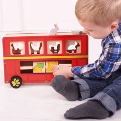 Ride around town in style with this expertly crafted Shape Sorter Bus, complete with a colourful collection of wooden animals! Let your imagination run wild as you post the animals through the side panel slots and switch passengers on the lower deck with the fun window slider.
