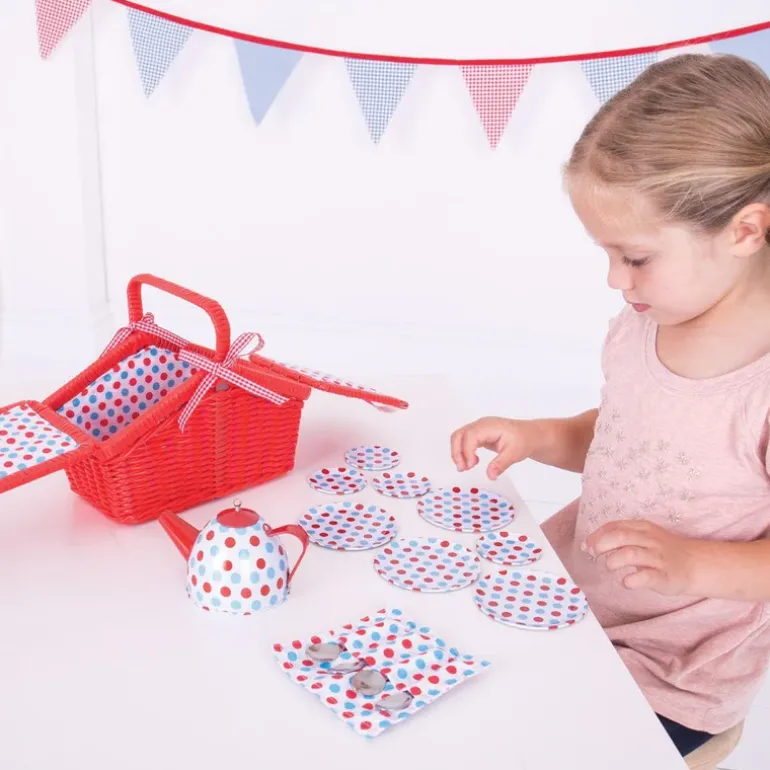 This delightful Spotted Kids Tea Set includes a red wicker picnic basket containing four cups and saucers, a teapot with a removable lid, four side plates, and four teaspoons in their own polka dot wrap.The Children’s Tea Set features everything your little one needs to host the perfect tea party for friends and family. The Red Wicker Picnic Basket makes it a great travel companion, and means your little host can ensure the set is stored away safely!A great way to encourage creative and imaginative role play.