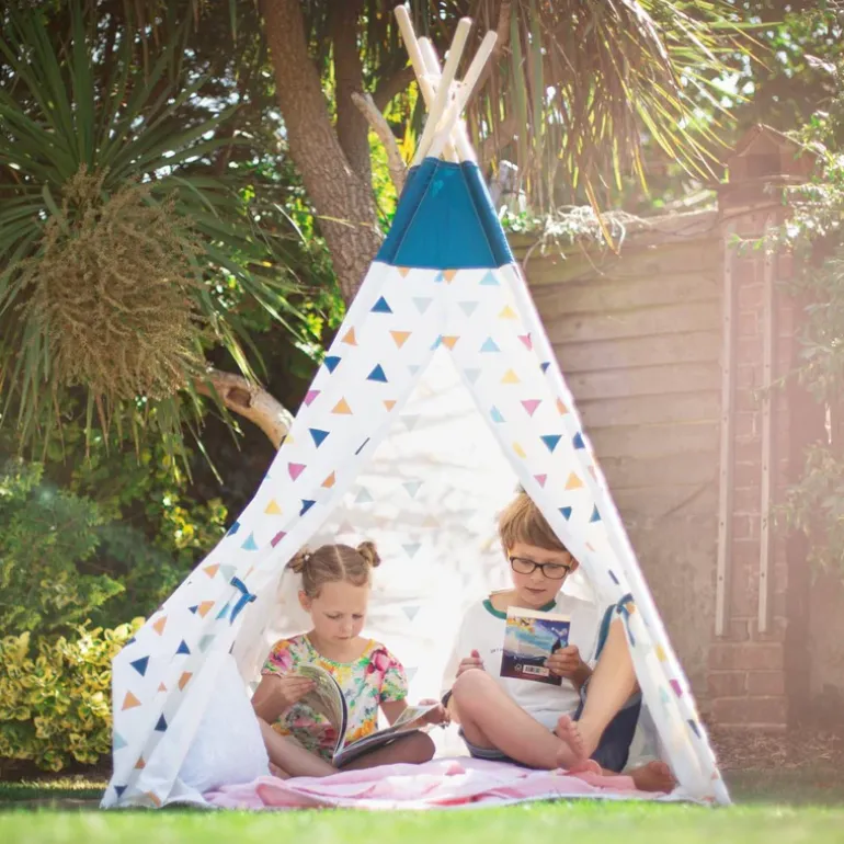 Magical adventures await for your little rascals with our 100% FSC® Certified Kids Teepee. Complete with curtains, this delightful kids teepee tent is everything your little one needs to make a nursery or bedroom a den to play in! Crafted from FSC® Certified materials (FSC® C147826), this children’s tent has been made in the most eco-friendly way possible. The neutral colour palette and delicate triangular print makes this outdoor a family favourite. Parents, grandparents, aunties and uncles can even fit inside. Play hide and seek or cosy up for reading time! The wooden teepee poles seamlessly slot together and the sewn bottom pockets keep the poles in place without the need for plastic.