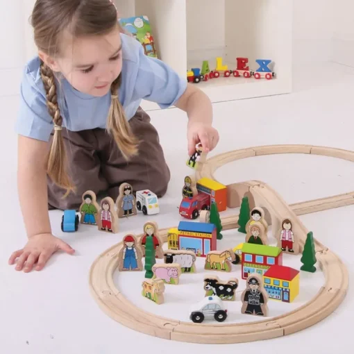 Accessorise your wooden train set with our Trackside Wooden Train Set Accessories. Workers, shoppers, farm animals, vehicles, houses and trees are all part of the backdrop that’ll engage bright young minds for hours at a time.Visit the shops, steam through a level crossing, pass by some woodland and then head for home. Consists of 32 play pieces.Most other major wooden railway brands are compatible with Bigjigs Rail.