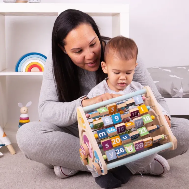 Explore the animal blocks, spin the alphabet squares, and sort the animal faces with our FSC® Certified Wooden Activity Centre. With five sides packed full of fun, tots can learn how to count with the abacus beads, how to match the different animals and much more!