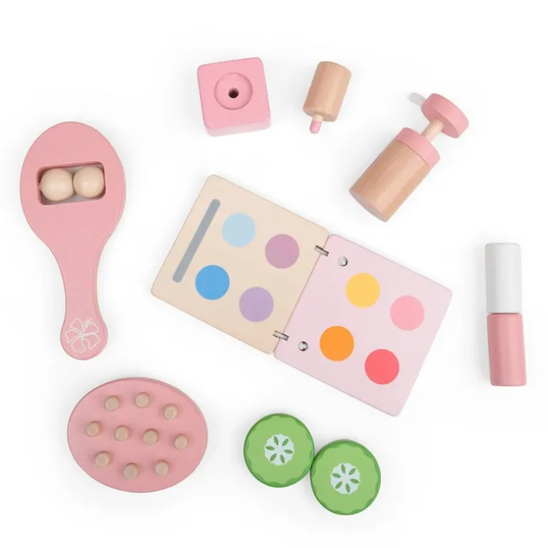 Designed with hours of imaginative play in mind, our children’s wooden vanity table comes with a vanity unit with two drawers and a mirror plus a wooden makeup compact, cucumber slice, face roller, hairbrush, lipstick, perfume and nail polish.