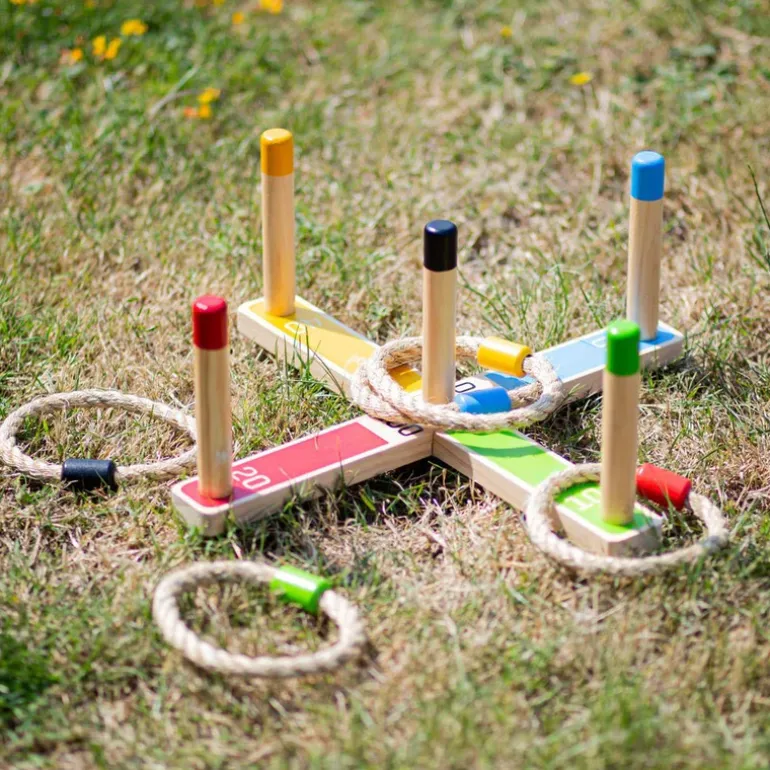 This classic Wooden Garden Quoits game requires skill and accuracy and will bring out the competitive streak in little ones as they attempt to hook the ropes over the brightly coloured poles and achieve the top score.Each rope is colour co-ordinated with one of the poles, to add to the fun. Play quoits individually or with family and friends, indoors or outdoors.Helps to develop dexterity and coordination, and improves maths skill.